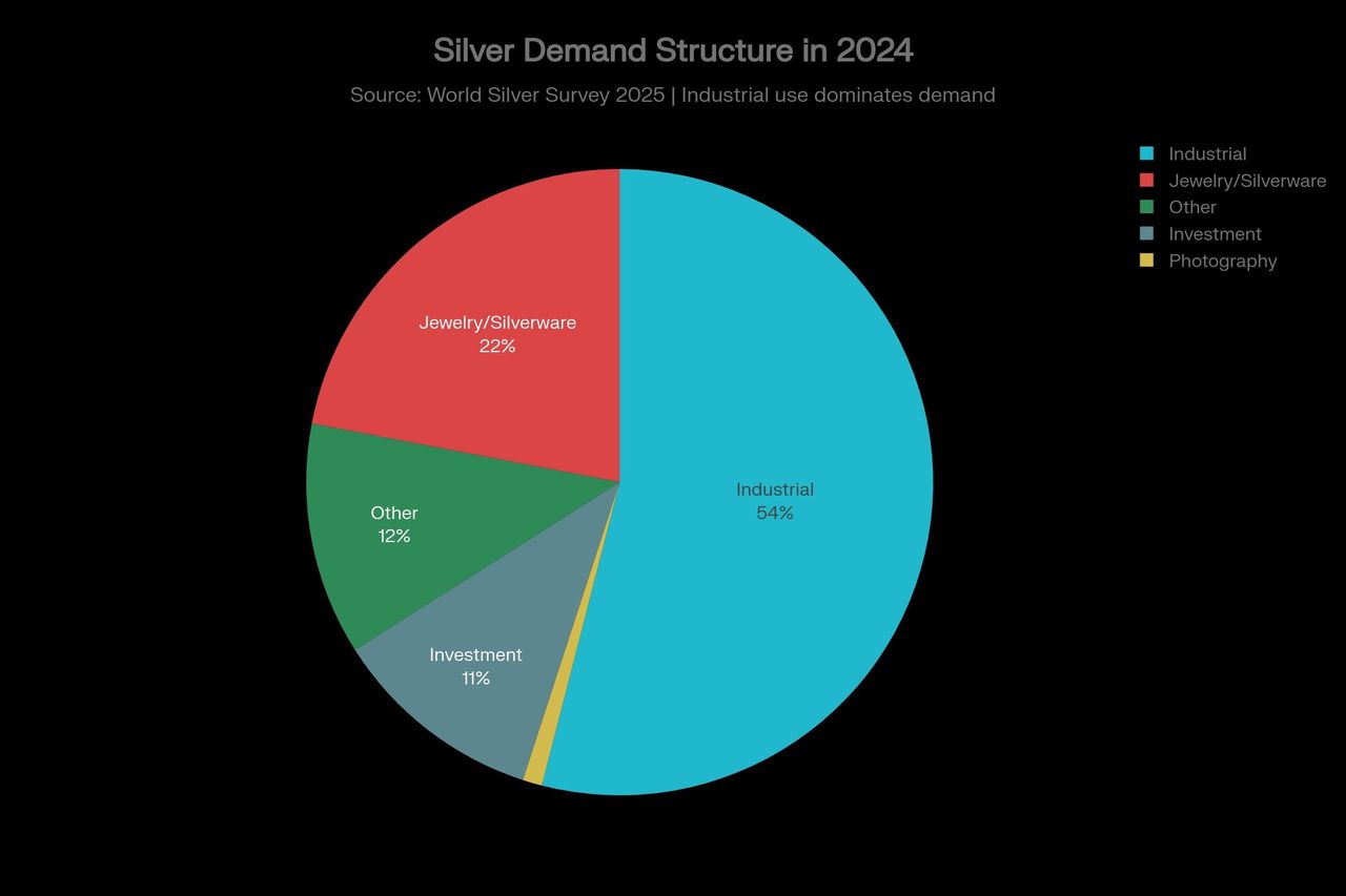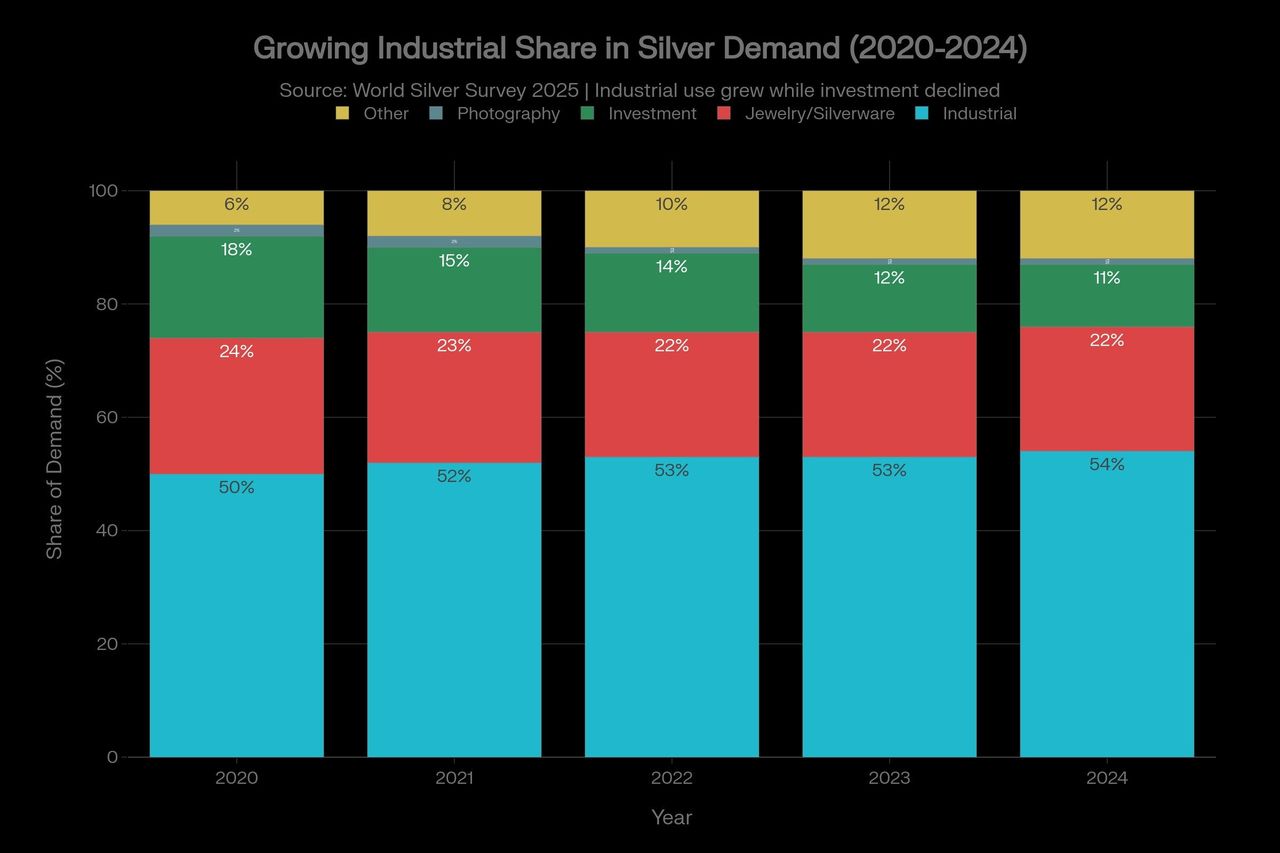 Рынок серебра за последние годы демонстрирует структурный дефицит (спрос превышает предложение на 100–200 млн унций ежегодно), с промышленным спросом как ключевым драйвером роста (рост на 4–7% в год).