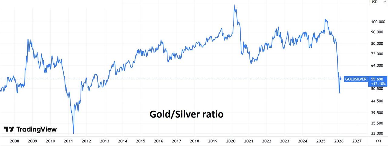 В январе 2026 г. отношение Gold/Silver показывало уникальные отклонения от своих средних значений. Ниже приведен график этого отношения за последние 15 лет. На нем видно, что текущее отношение цены золота к серебру составляет 55,7. Хотя во время ралли серебра в конце января это отношение опускалось до 48,4 — это был минимальный уровень с сентября 2011 г. То есть серебро в силу вышеуказанных причин оказалось перекуплено относительно золота. Отсюда вывод: либо цена на золото должна быть выше, либо стоимость серебра должна скорректироваться. Однако стоит отметить, минимум по Gold/Silver в 2011 г. был в районе 32, а ниже отметки 50 это отношение держалось тогда около года.
