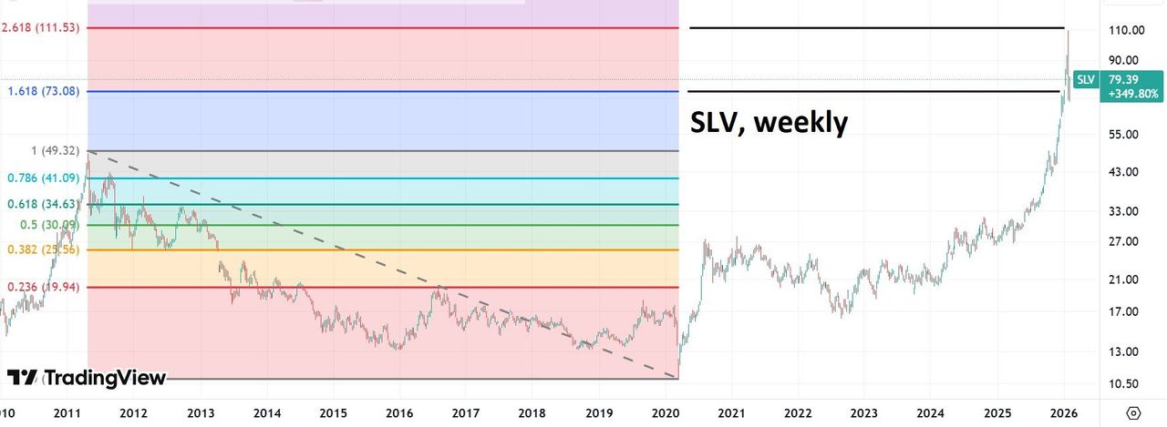 Поскольку в конце января 2026 г. котировки паев SLV обновляли исторические максимумы и слишком высоко отклонились от ближайших поддержек, мы можем использовать инструмент «расширение Фибоначчи», чтобы попытаться определить, где могут находиться целевые уровни. Мы видим, что уровень Фибо 261% от коррекции цены SLV с ценового максимума 2011 г. ($46,82) до минимума 2020 г. ($12,2) дает нам на графике уровень $109, что примерно соответствовало максимумам января. Это не значит, что в дальнейшем цена прекратит рост. Достаточно часто в таких точках цена может остановить подъем и на какое-то время уйти в волатильную консолидацию. В начале февраля мы это увидели. Цена на SLV может быстро вернуться на прежние ценовые максимумы, поскольку вышеуказанные факторы роста пока остаются в силе.