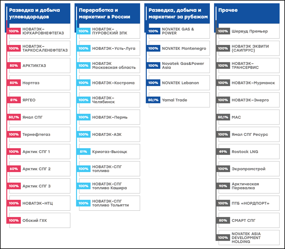 У компании несколько крупных дочек и совместных предприятий. Среди них выделяются «ЯМАЛ СПГ» с долей владения 50% и «АРТИК СПГ 2» с долей 60%. Это ключевые проекты по производству сжиженного природного газа. «ЯМАЛ СПГ» – действующий проект, способный производить более 20 млн тонн СПГ.
