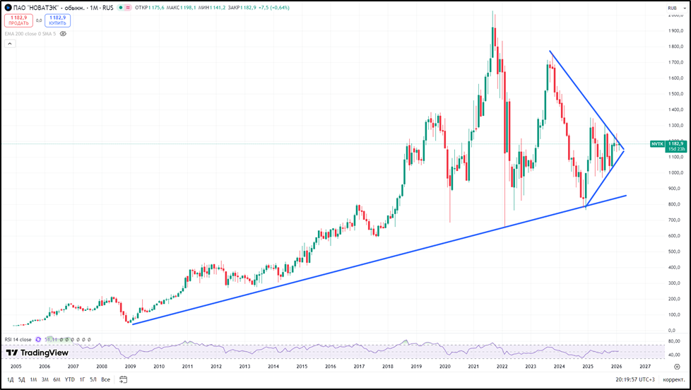 На данный момент акции торгуются на 40% ниже максимумов 2021 года, но формально, долгосрочный растущий тренд пока не сломлен. За прошлый год котировки подросли на 23%, не считая дивидендов. Динамика 2026 года пока околонулевая.