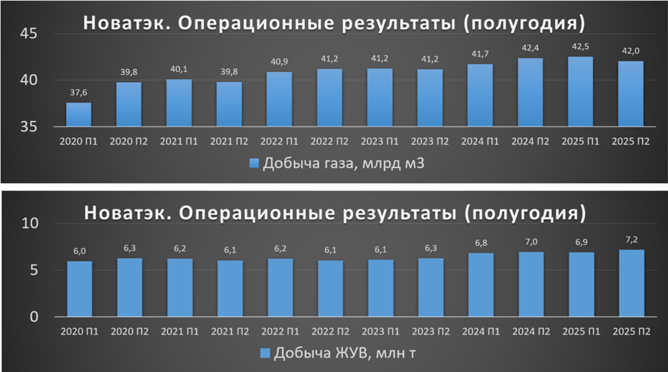 Если посмотреть на полугодовую динамику, то видим, что добыча газа в 2П 25 на 1% ниже рекордов 1П 25 и 2П 24. А добыча жидких углеводородов обновила рекорд. Правда, темпы роста не высокие.
