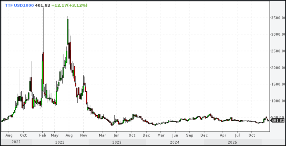 Цены на газ в Европе нормализовались после аномальных скачков 2021-2022 годов. Последние 2 года они относительно стабильны. При этом текущая цена примерно в 1,5 раза выше, чем до 2021 года. Схожая динамика и на рынках Азии.
