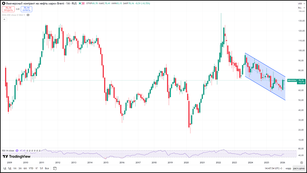 Кроме газа Новатэк реализует и жидкие углеводороды. Плюс компания в долгосрочных СПГ-контрактах ориентируется на привязку к цене на BRENT. Поэтому, важно следить и за ней. Средняя цена BRENT в 2025 году 68 долларов за баррель (-15% г/г). Текущая цена BRENT в районе 70 долларов за баррель.