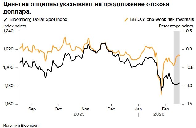 Индекс доллара Bloomberg увеличился на 0,1%. Это произошло на фоне роста иены на 0,4%. При этом снижение других валют в корзине способствовало укреплению индекса. Рынки опционов свидетельствуют о снижении медвежьих настроений в краткосрочной перспективе. Краткосрочные рисковые развороты находятся на минимальном отрицательном уровне за последний месяц.