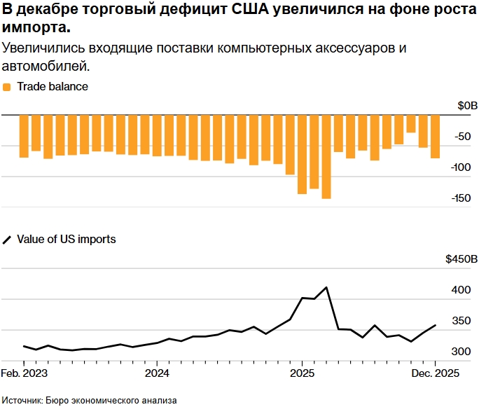 В декабре дефицит торгового баланса США вырос до 70,3 миллиарда долларов, что увеличило годовой дефицит до 901,5 миллиарда. Рост дефицита обусловлен увеличением импорта на 3,6% и снижением экспорта на 1,7%. Торговые данные в 2025 году были нестабильными из-за постоянных заявлений президента Дональда Трампа о введении тарифов.