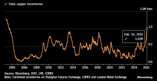 Запасы меди на складах, отслеживаемых Лондонской биржей металлов (LME), во вторник, 17 февраля, выросли на 4,6% и составили 221 625 тонн, что способствовало дальнейшему увеличению общих запасов на биржах в Шанхае, Лондоне и Нью-Йорке до более чем 1 миллиона тонн.