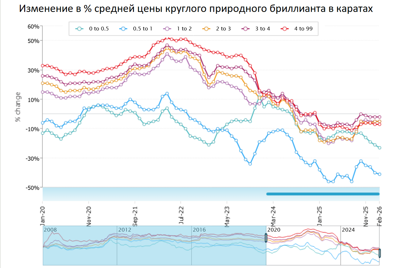 Rapaport отдельно отмечает, что мелкие камни сильнее всего пострадали из-за конкуренции с искусственно выращенными алмазами и тарифов/геополитики, в то время, как спрос и цены на крупные камни держались лучше рынка. Это говорит о том, что особенностью 2025 года стал растущий разрыв в ценовой динамике между крупными и малыми алмазами.