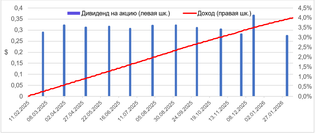 Ровно год назад (11 февраля 2025 года) мы выпустили апдейт по акциям SPDR Bloomberg 1-3 Month T-Bill ETF. Наш прогноз полностью оправдался, и 12М цель по совокупному доходу (фонд ежемесячно выплачивает дивиденды, распределив с момента нашего последнего обзора суммарно $3,72 на акцию) в настоящий момент достигнута.