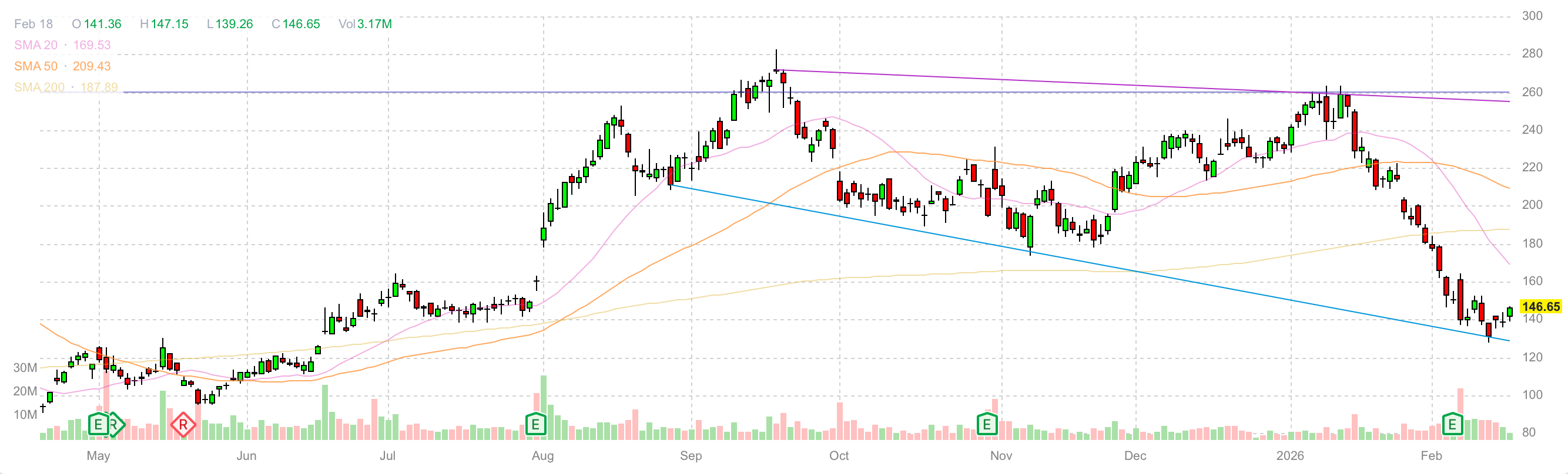 Reddit остаётся востребованной акцией роста и продолжает уверенно поддерживать высокие темпы развития. Результаты за 4-й квартал 2025 года подтвердили это: показатель DAUq вырос на 19% г/г, а WAUq — на 25% г/г, при этом ARPU увеличилась на 42% г/г. Основной вклад в прирост аудитории платформы внесли международные рынки, что соответствует стратегии глобальной экспансии компании.