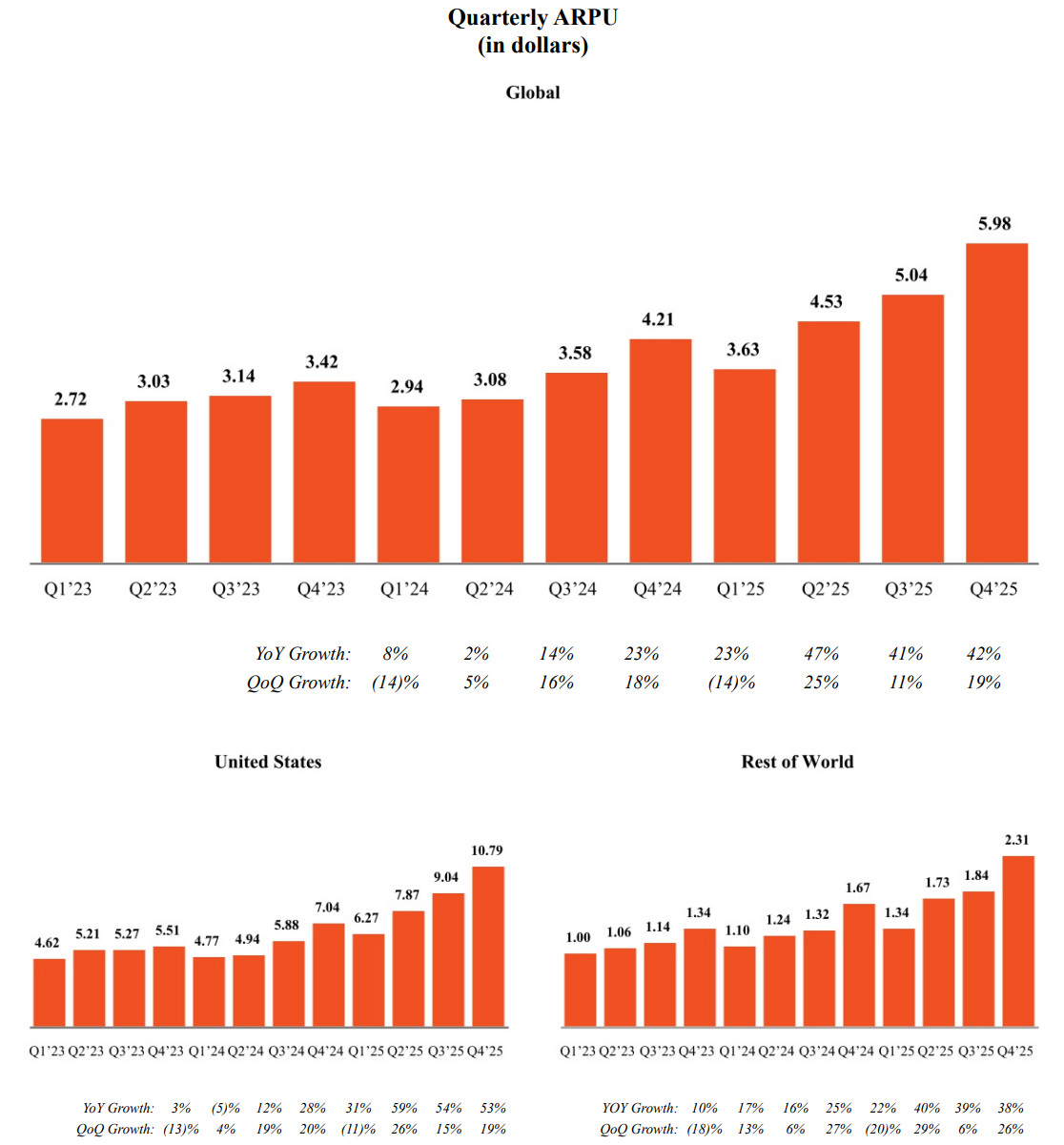 Монетизация демонстрирует сильную динамику как в США, так и за рубежом: ARPU в США выросла на 53% г/г, а на международных рынках — на 38% г/г. Устойчивый рост ARPU, особенно на ключевом американском рынке, отражает эффективность новых рекламных инструментов и решений Reddit, благодаря которым рекламодатели увеличивают бюджеты, выделяемые для платформы.