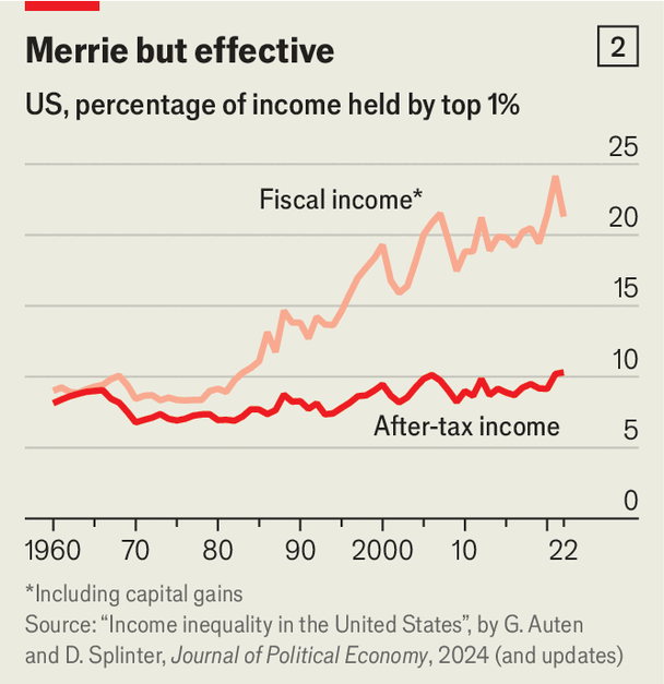Правительства используют богатство богатых неоднозначно. Одна задача — снизить налоги для остальных. «Средний британец сейчас платит самую низкую ставку с 1975 года», - хвастался Джереми Хант (министр финансов в 2024-м). Схожие тенденции и в других странах. Налоговая нагрузка на 80% населения США (нижние четыре квинтили) сегодня заметно ниже, чем в 1960-1970-х годах. Особенно система стала прогрессивнее благодаря увеличению налогового кредита для малообеспеченных в 1990-е.