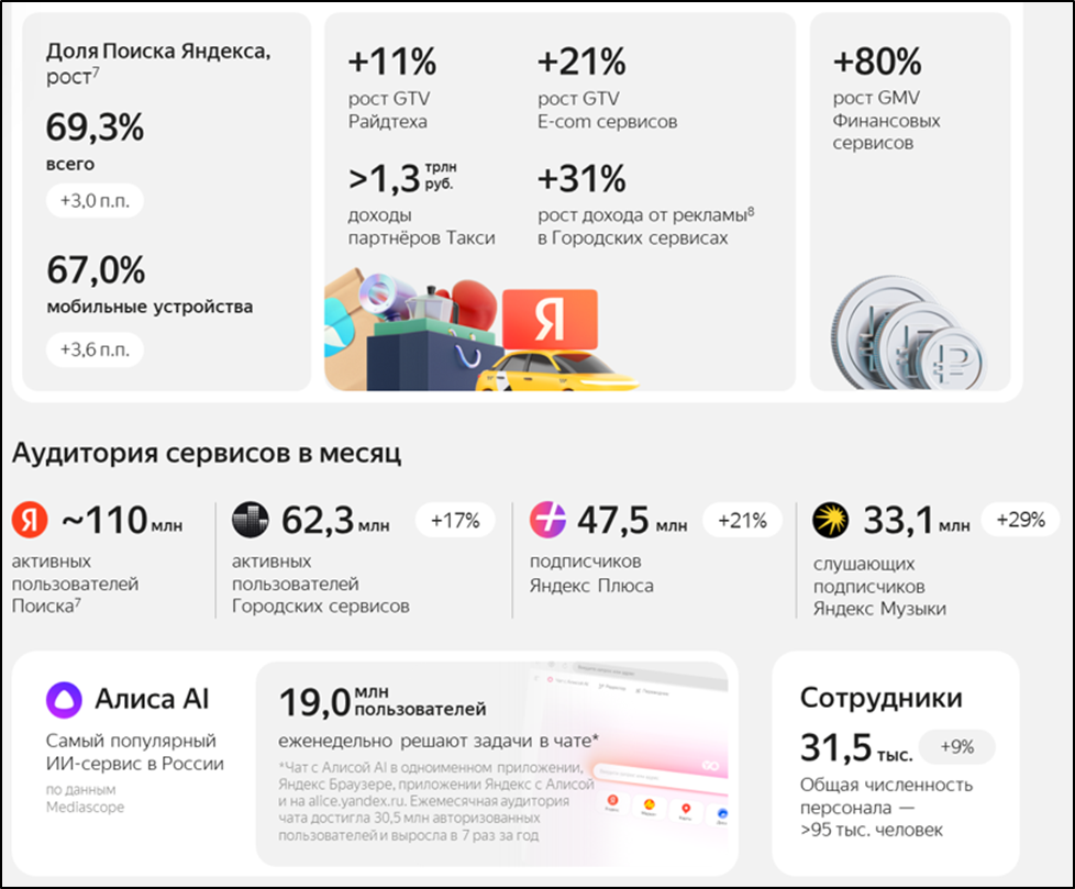 «Поиск». 110 млн активных пользователей в месяц. Доля компании на российском поисковом рынке 69% (+3 п.п. г/г).