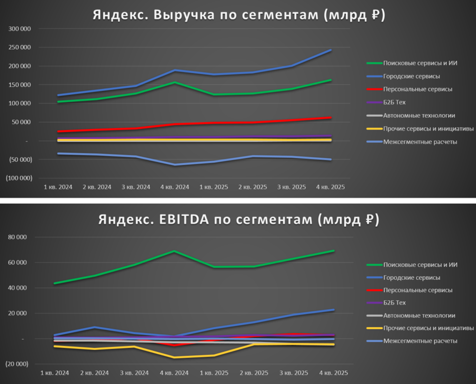 Основную выручку генерируют: «Городские сервисы» (56% от выручки), «Поисковые сервисы и ИИ» (37%). При этом рост выручки сегмента поисковых сервисов в 4Q2025 составил всего 4% г/г. А остальные направления пока остаются быстрорастущими. Яндекс все меньше зарабатывает на поиске и ИИ и больше — на такси, доставке и маркетплейсе.
