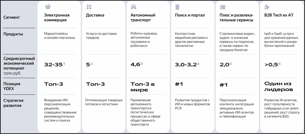 Бизнес модель Яндекса построена на развитии новых перспективных сервисов за счёт доходов от ключевых прибыльных сегментов. На текущий момент основными прибыльными сегментами являются: «Поисковые сервисы», «Райдтех».