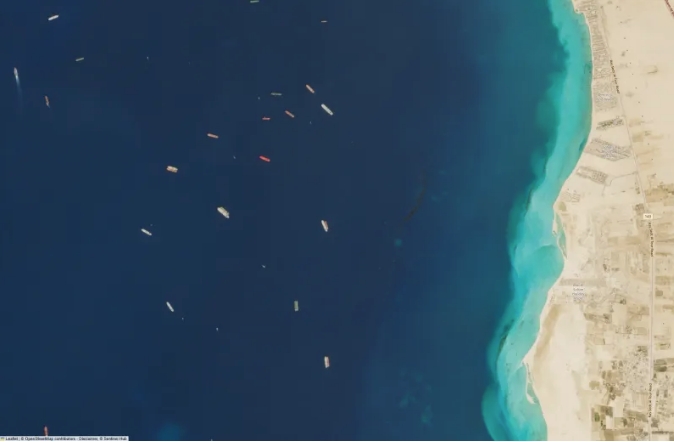На спутниковом снимке южной части Суэцкого канала от 16 февраля виден сверхбольшой танкер VLCC с белой палубой, пришвартованный рядом с небольшим судном с серой палубой. Это может свидетельствовать о перегрузке груза между судами.