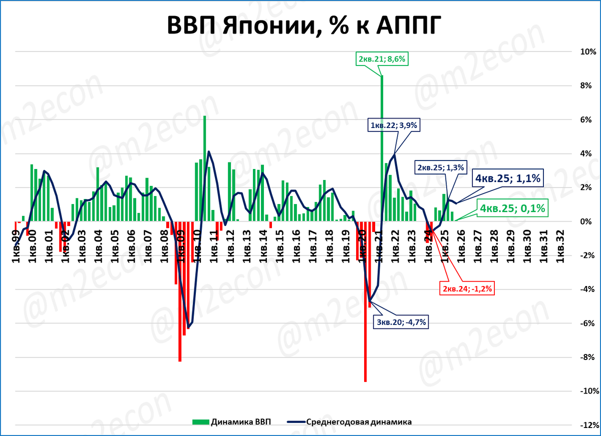 В январе рост РДМ Японии составил 0,1% к январю прошлого года. ВВП Японии в 4 квартале вырос на 0,1% к четвёртому кварталу 2024 года. В 2025 году экономика Японии выросла на 1,1%. В 2026 году рост замедлится до 0,7% (МВФ).