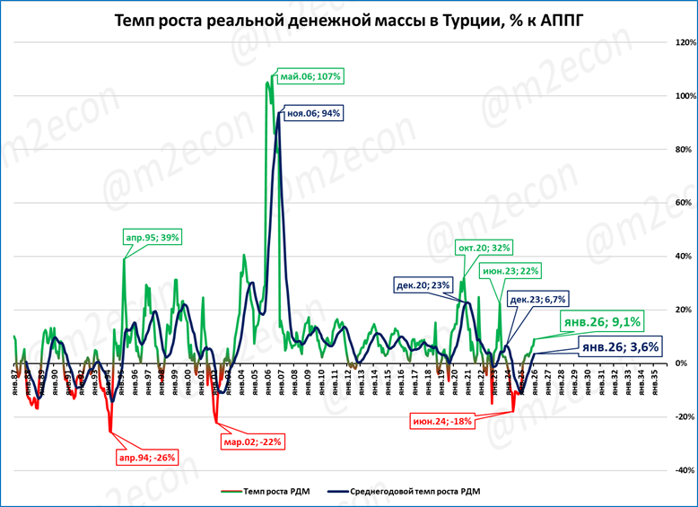 В январе рост РДМ Турции составил 9,1% к январю 2025 года. Рост ВВП в 3 квартале составил 3,7% к 3 кварталу 2024 года. Итоги года пока неизвестны.