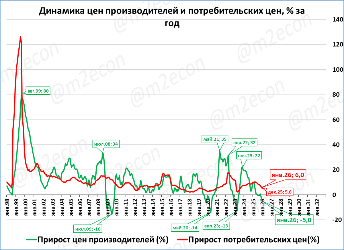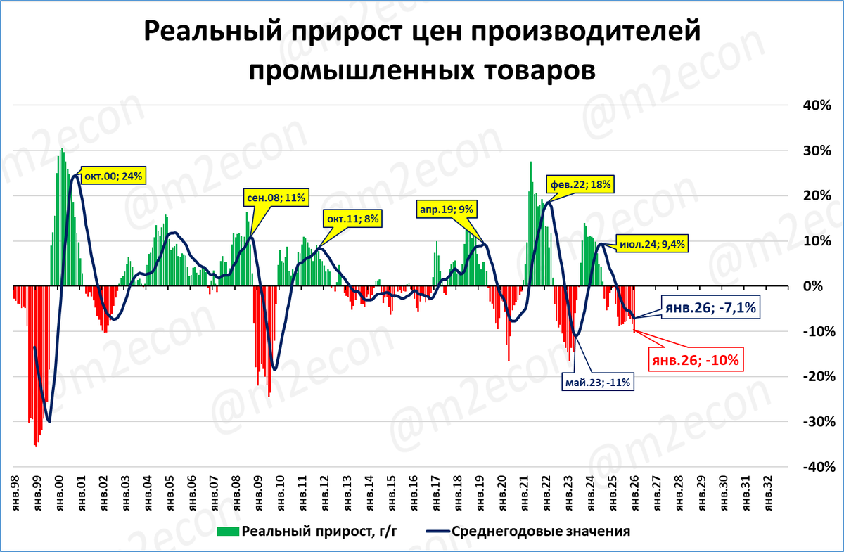 Цены производителей по итогам января снизились: -5,0% к январю 2025 года. Они отстают от роста потребительских цен (+6,0%). В реальном выражении цены производителей падают ещё сильнее, -10%. Это негативный сигнал, и он усиливается.