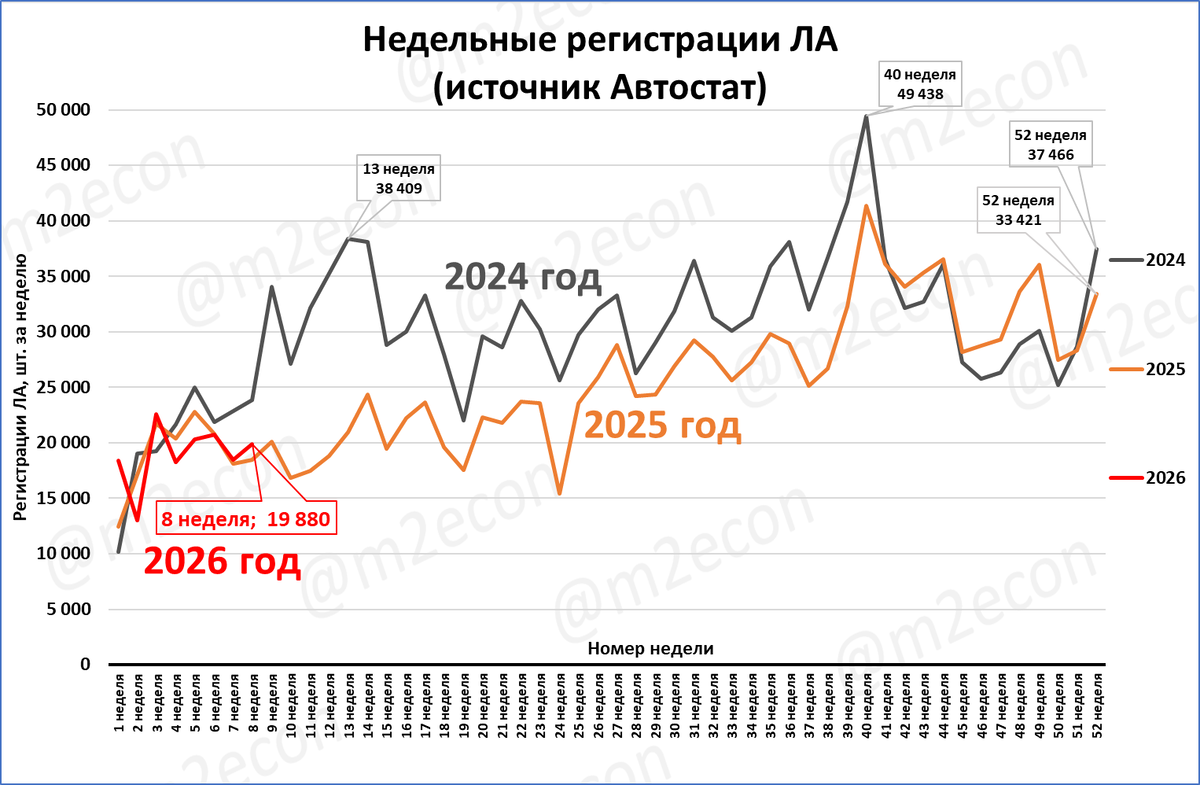 По данным агентства «Автостат», регистрации легковых автомобилей на 8 неделе составили 19,9 тыс. шт.