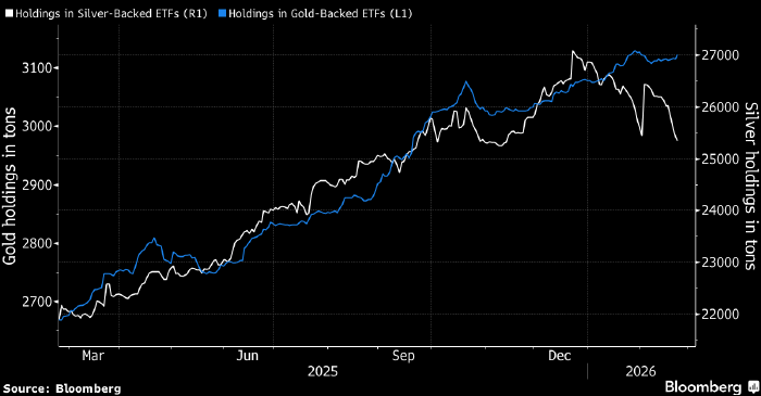 Подобное расхождение между потоками капитала в «золотых» и «серебряных» ETF говорит о том, что восстановление цен на золото имеет более солидное фундаментальное основание, чем восстановление цен на серебро, отмечает стратег Bloomberg Джейк-Ллойд Смит.