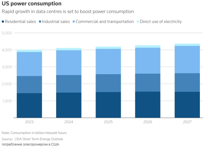 Однако давление на энергетическую инфраструктуру уже нарастает. Годовое потребление электроэнергии в США в 2025 году достигло рекордного уровня, составив 4195 тераватт-часов. Цены на электроэнергию по всей стране выросли в среднем на 7% за год по январь включительно. Согласно прогнозам Международного энергетического агентства, спрос на электроэнергию будет продолжать расти в среднем почти на 2% в год в период с 2025 по 2030 год, что более чем вдвое быстрее, чем за последнее десятилетие, в основном за счёт расширения центров обработки данных, что создаёт дополнительную нагрузку на электросети.