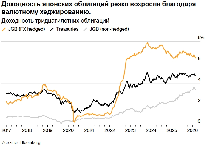 Доходность 20-летних и 30-летних японских облигаций с хеджированием относительно доллара США составляет 6,06% и превышает доходность аналогичных казначейских облигаций более чем на 140 и 175 базисных пунктов соответственно. Однако такая торговля сопряжена с рисками.