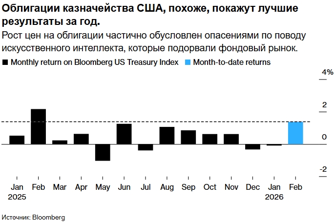 За прошедший месяц, когда на других рынках царила неопределенность — от тревожных сигналов о разрушительной и потенциально дефляционной силе искусственного интеллекта до усиления геополитической напряженности и опасений по поводу рисков в частном кредитовании, — трейдеры активно приобретали государственные облигации США.