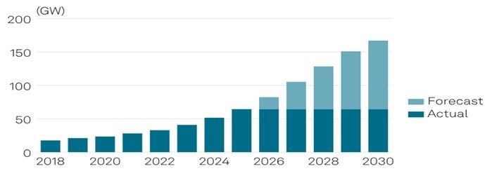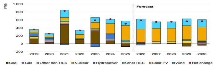 На этом фоне выработка электроэнергии на угольных станциях сократилась примерно на 1,2% (г/г). Это подчеркивает меняющуюся роль угольной генерации в энергосистеме, где она все чаще используется для обеспечения гибкости и резервирования переменной возобновляемой генерации. Хотя уголь остается крупнейшим источником электроэнергии в абсолютных величинах, его доля в общей выработке будет постепенно сокращаться ― с 55% в 2025 году до 43% в 2030 году.