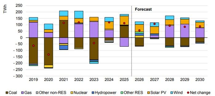 МЭА прогнозирует, что структура выработки электроэнергии в Китае в 2026-2030 гг. будет продолжать смещаться в сторону низкоуглеродных источников. Ожидается, что солнечная энергетика и ветроэнергетика будут расти высокими темпами. Производство электроэнергии на солнечных установках, по прогнозам, будет увеличиваться в среднем более чем на 19% в год, тогда как рост ветровой генерации стабилизируется на уровне 13% в год. За тот же период выработка атомной энергии, как предполагается, будет расти почти на 6% ежегодно благодаря вводу новых реакторов.