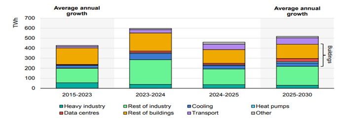 Сектор зданий обеспечил 41% роста спроса в период 2021-2025 гг., значительная часть которого была связана с увеличением использования систем кондиционирования воздуха в офисах и домохозяйствах, сформировавших 17% прироста внутри сектора. Развитие цифровой инфраструктуры, включая дата-центры и телекоммуникационные сети, обеспечило более 7% прироста общего спроса на электроэнергию в секторе зданий по сравнению с 2020 годом. При этом ожидается, что к 2030 году рост использования кондиционеров и развитие дата-центров будут формировать все большую долю прироста спроса на электроэнергию, обеспечивая около 15% каждый.