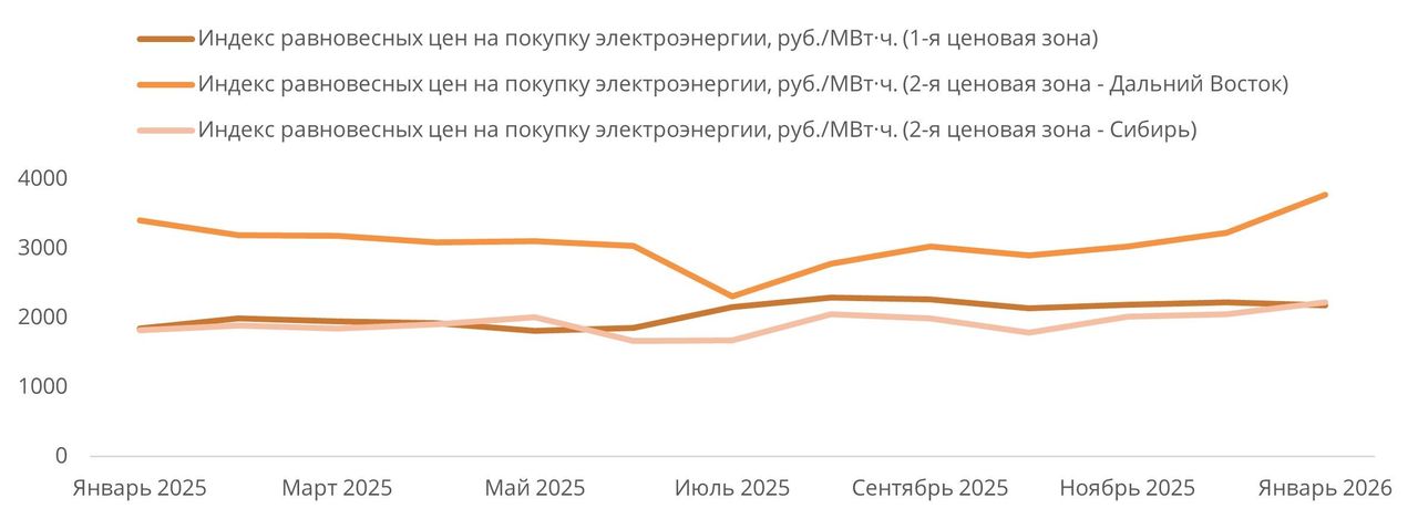 В январе 2026 года индекс РСВ относительно декабря 2025 года в первой ценовой зоне снизился на 1,6% на фоне роста эффективного предложения, прежде всего за счет увеличения выработки АЭС. Во второй ценовой зоне показатель, напротив, вырос на 8,1%, вследствие увеличения спроса на электроэнергию на фоне снижения температуры наружного воздуха, тогда как в ОЭС Востока индекс прибавил 17% в результате повышения цены предложения ТЭС на фоне удорожания угля.