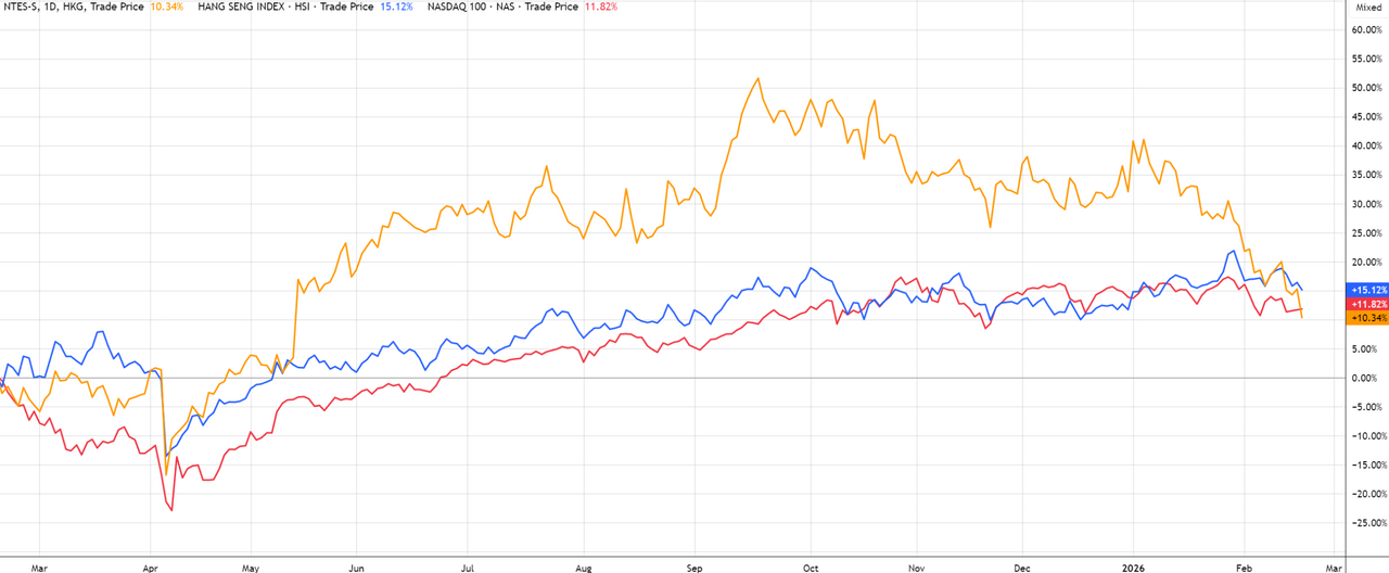Ребазированная динамика акций NetEase и индексов Nasdaq и Hang Seng за год