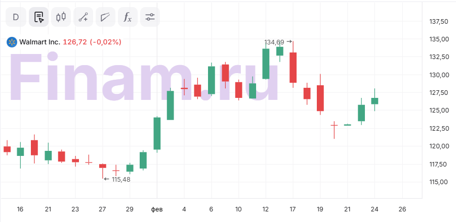 Walmart опубликовала сильные результаты за четвертый квартал и весь финансовый 2026 год, превысив ожидания аналитиков по прибыли на акцию и показав устойчивый рост выручки. За квартал скорректированная прибыль на акцию составила $0,74, что чуть выше консенсуса рынка, а выручка выросла на 5,6% до $190,7 млрд, в точности совпав с рыночными прогнозами. По итогам всего года компания увеличила выручку в постоянной валюте до $715,9 млрд (+5,1% г/г), а скорректированный EPS достиг $2,64(+5,2% г/г).