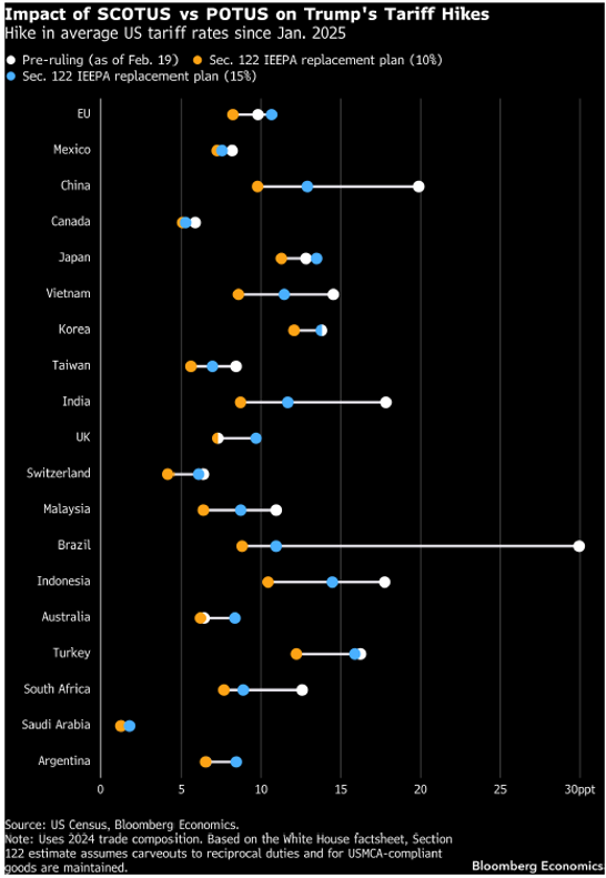 По оценке Bloomberg Economics, решение Верховного суда снизило эффективную среднюю ставку импортного тарифа США с 13,6% до 6,5%; введение Трампом 10% глобальной импортной пошлины с учетом исключений повысит ее до 10,2%, а повышение ставки тарифа до 15% увеличивает эффективную ставку тарифа примерно до 12%. По расчетам Bloomberg Intelligence, от замены тарифов IEEPA на глобальный тариф 15% могут выиграть страны с наиболее высоким уровнем тарифов IEEPA – прежде всего, Бразилия и Китай (10% тариф за фентанил), в меньшей степени Индия и Индонезия, Канада и Мексика (отмена 35% и 25% тарифа за фентанил вне импорта, необлагаемого этими тарифами по USMCA), проиграть же могут страны с наиболее благоприятным уровнем тарифов IEEPA, например, Великобритания и Австралия. По оценкам аналитической компании Global Trade Alert, занимающейся мониторингом торговой политики, положение ЕС в результате изменений несколько ухудшится – в целом для ЕС тариф в торговле с США увеличится на 0,8 п.п., при этом Италия столкнется с дополнительными 1,7 п.п. американских тарифов.