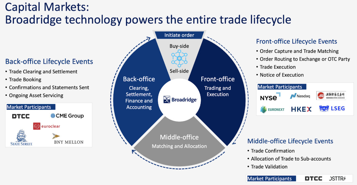 Первая часть бизнеса — это инфраструктура для общения компаний с инвесторами. Broadridge печатает и рассылает отчеты, уведомления и материалы голосований, а также предоставляет их в цифровом формате. Когда у публичной компании проходит собрание акционеров, необходимо организовать рассылки, сбор голосов и подсчет результатов. Broadridge фактически стандартизировала этот процесс для большого числа участников рынка и зарабатывает на регулярных контрактах, а также на объеме рассылок и событиях, таких как сезон голосований.