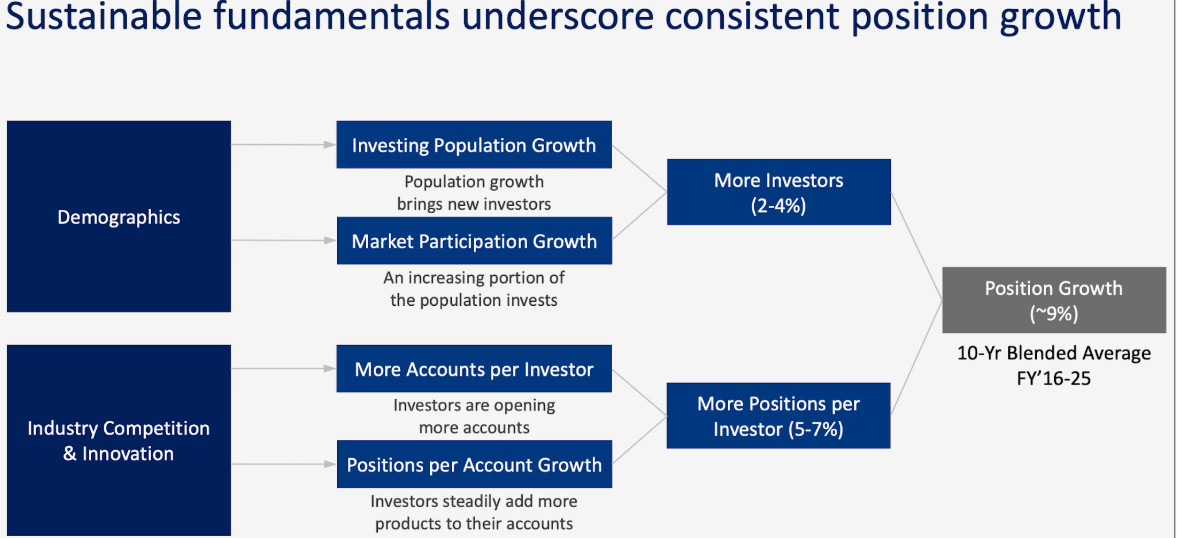 Ключевой момент инвестиционного кейса Broadridge — смена стадии развития wealth-платформы. Речь идет о технологической системе для банков, брокеров и инвестиционных консультантов, которая объединяет процессы работы с клиентом, от открытия счета и портфельной аналитики до расчета операций, отчетности и коммуникаций. То есть это цифровая инфраструктура для бизнеса по управлению капиталом.