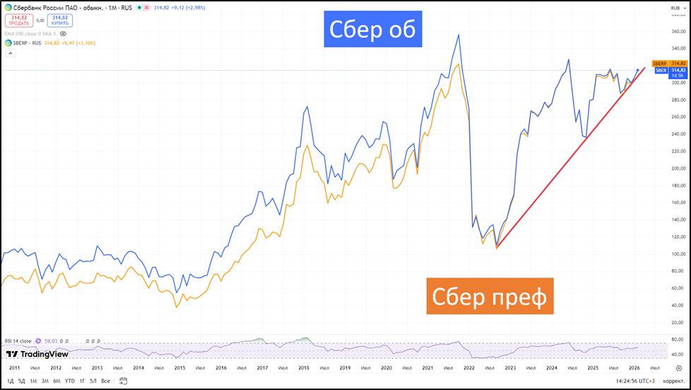 На Московской бирже торгуются обыкновенные и привилегированные акции Сбербанка. Последнее время цена этих акций практически совпадает. Поэтому лучше покупать обыкновенные акции.