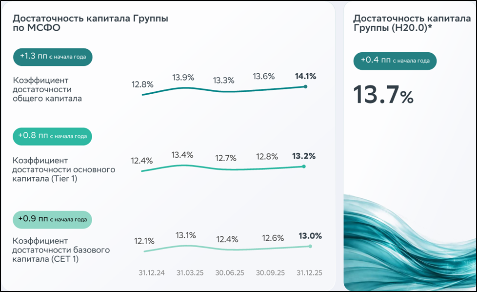 По итогам 2025 года видим рост коэффициентов достаточности капитала. Текущие значения с хорошим запасом превышают нормативы. Финансовое положение Сбера устойчивое.