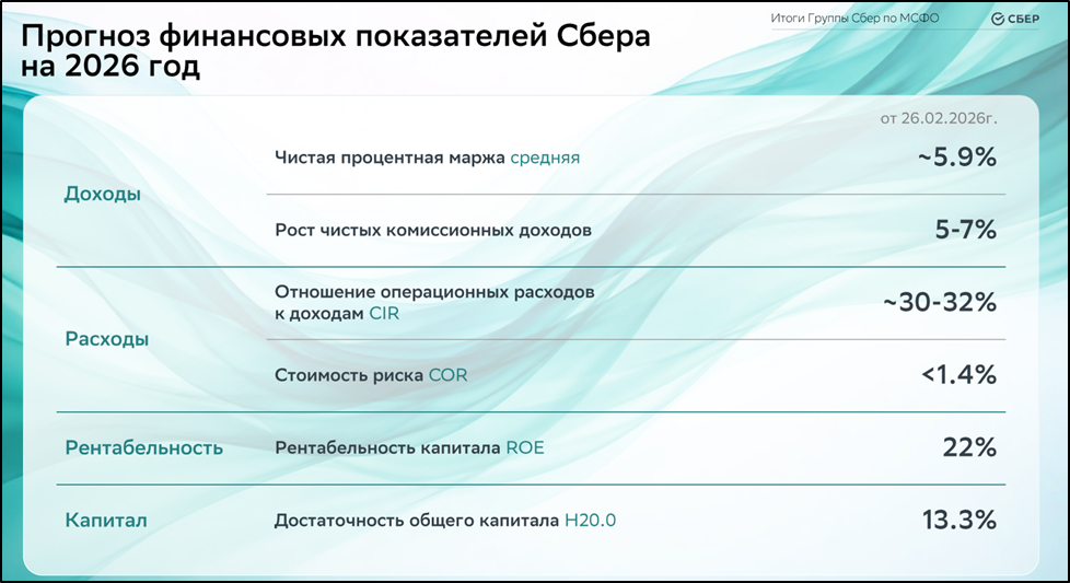 Сбер подтвердил прогнозы на 2026 год. Ожидается, что кредитный портфель увеличится примерно на 11%, ЧПМ (Чистая процентная маржа) будет 5,9% (а сейчас 6,2%). Рост комиссионных доходов 5-7%. Рентабельность капитала 22%. Достаточность общего капитала должна 13,3%.