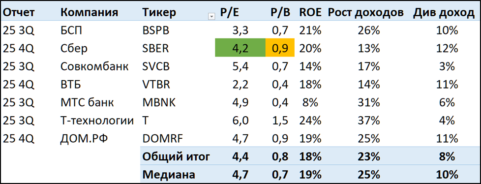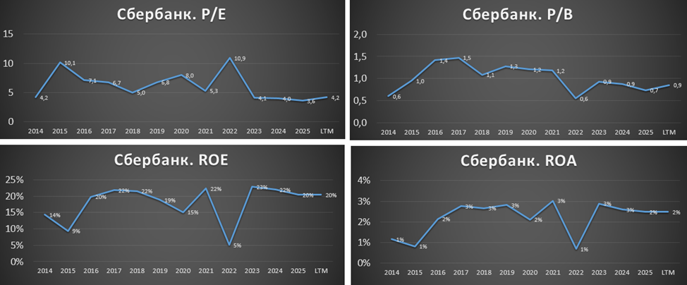 P/E = 4,2; P/B = 0,8; ROE = 20%.