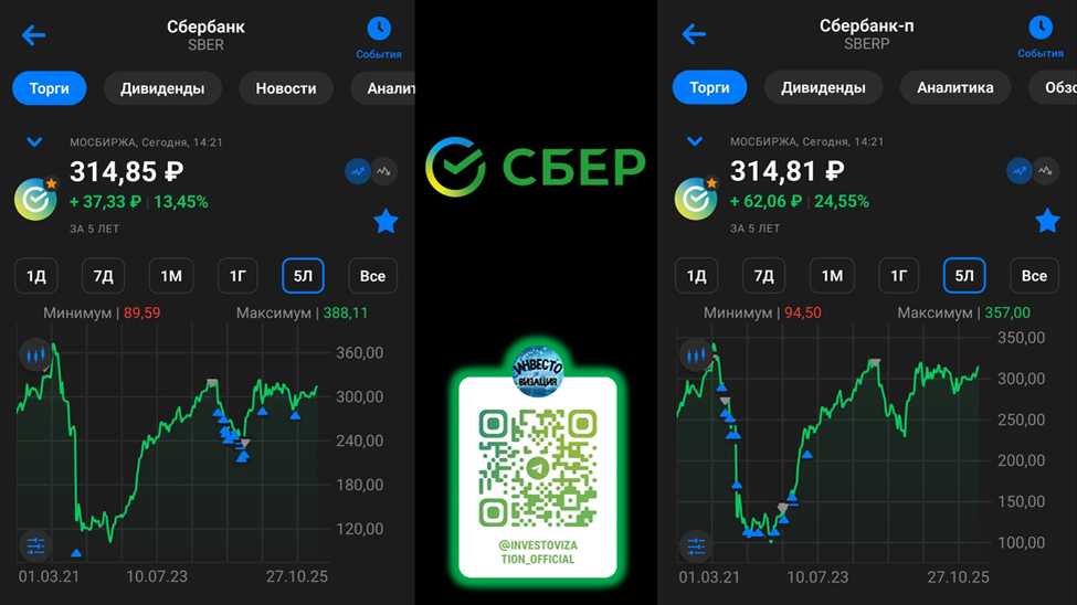 Капитализация = 7,1 трлн (SBER = 314,8₽; SBERP = 314,8₽).