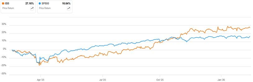 ДИНАМИКА ДОХОДНОСТИ ISHARES BIOTECHNOLOGY ETF В СРАВНЕНИИ С ИНДЕКСОМ S&P 500 ЗА 12 МЕС.