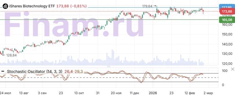 Рассматриваемый биотехнологический ETF за последние 12 мес. уверенно опережает рынок по доходности — инструмент прибавил 27% в сравнении с ростом индекса S&P 500 на 17%. За последний месяц ралли фонда взяло паузу, при этом цена находится в области исторических максимумов.