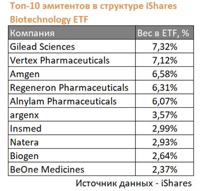 Наибольшие доли в рассматриваемом ETF имеют биотехнологические компании Gilead Sciences, Vertex Pharmaceuticals, Amgen, Regeneron Pharmaceuticals и Alnylam Pharmaceuticals.