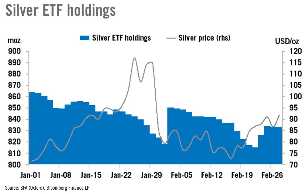 Инвесторы в ETF делают ставку на серебро. Глобальные запасы серебра в ETF выросли более чем на 18 млн унций на прошлой неделе, поскольку восстановление цен побудило некоторых инвесторов увеличить свои инвестиции в серебро. Однако общий объём в 834 млн унции всё ещё ниже, чем 864 млн унции в начале года и 870 млн унций в конце декабря.