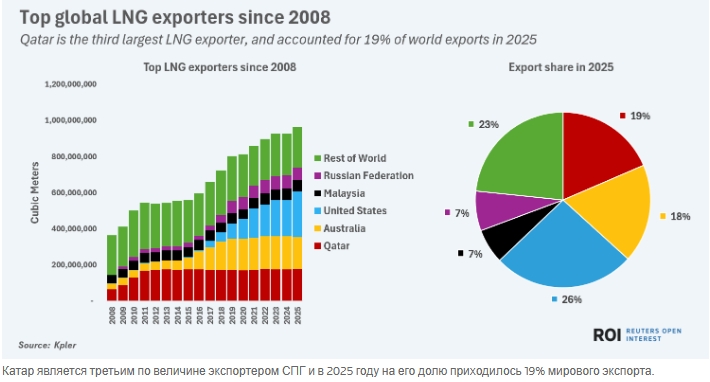 Катар является третьим по величине экспортером СПГ, и в 2025 году его доля в мировом экспорте составила 19%.