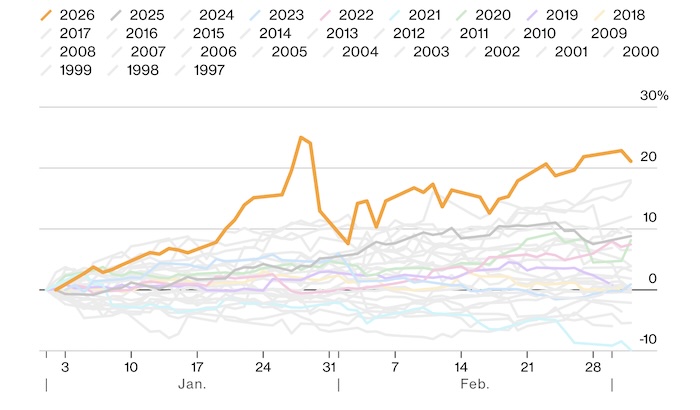 С начала года золото подорожало почти на одну пятую. В конце января цена достигла исторического максимума выше $5 595 за унцию. Рост поддерживали геополитическая напряженность, торговые конфликты и опасения по поводу независимости Федеральной резервной системы США.