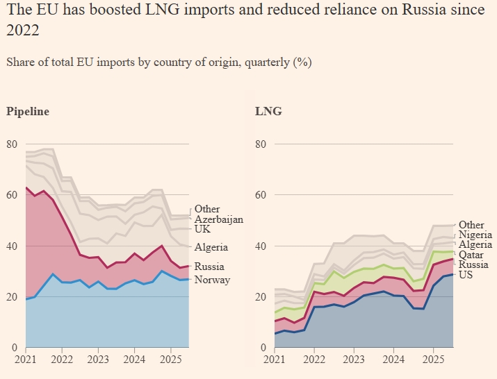 С 2022 года Евросоюз изменил свои источники поставок газа и перестал зависеть от России. Теперь он импортирует больше американского газа и увеличивает объемы закупок у Норвегии.