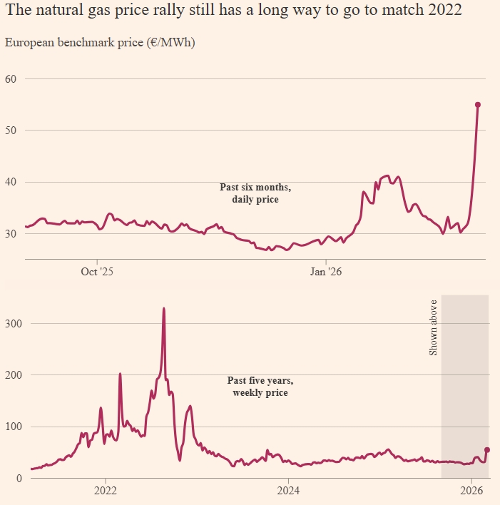 Филип Лейн, главный экономист Европейского центрального банка, предупредил, что длительная война на Ближнем Востоке может привести к значительному увеличению инфляции из-за роста цен на энергоносители и резкому падению объемов производства. При этом цены на газ в Европе, которые сейчас составляют около 54,50 евро за мегаватт-час, все еще значительно ниже пикового уровня в 340 евро/МВтч, достигнутого в 2022 году.
